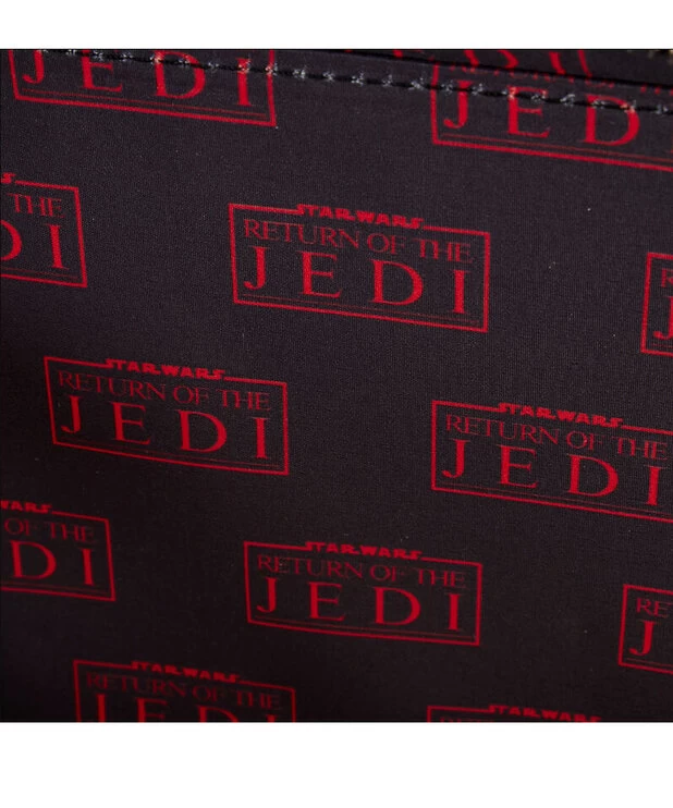Le sac à bandoulière Loungefly Return of the Jedi Lunch Box est fabriqué en cuir végétalien (polyuréthane) et présente des détails imprimés. Le sac a une bandoulière réglable (détachable) et du matériel métallique robuste. Notez la doublure intérieure coordonnée.