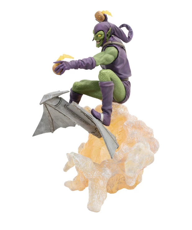 - L’ennemi de Spider-Man, le gobelin vert, surgit d’un nuage de fumĂ©e sur son planeur gobelin, se prĂ©parant Ă lancer une paire de bombes citrouilles sur le lanceur de toile !
