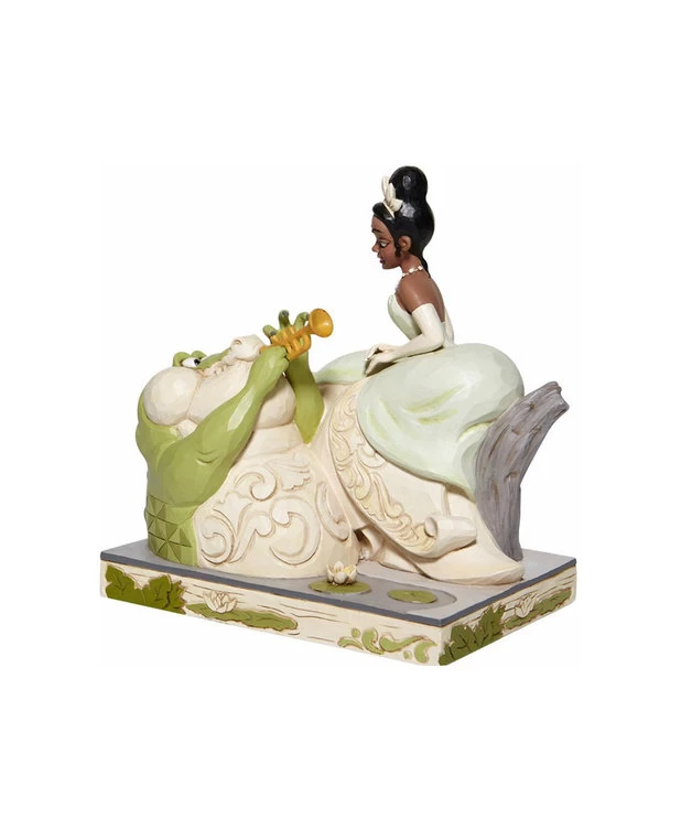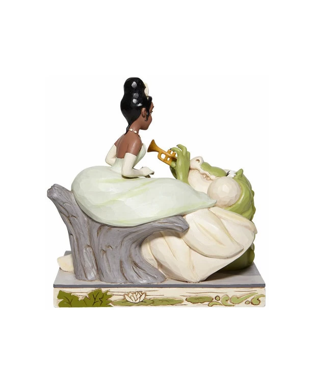 Tiana est portée sur des nénuphars tandis que Louie lui fait une sérénade avec sa trompette dans cette charmante scène de La princesse et la grenouille de Disney.Fabriqué à la main dans des détails époustouflants, ce design ravissant présente la subtile palette de couleurs White Woodland de Jim Shore.