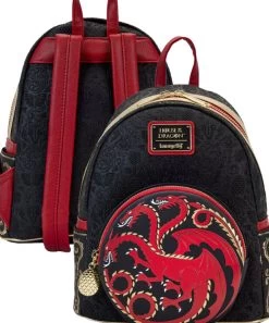 Le mini sac à dos Loungefly House of the Dragon Targaryen est fabriqué en cuir végétalien (polyuréthane). Le sac a des bretelles réglables et du matériel doré brillant. Les caractéristiques supplémentaires incluent des détails appliqués, métalliques, gravés, brodés et imprimés. Notez la doublure intérieure coordonnée.