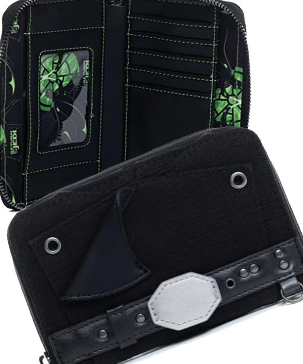 - Ce portefeuille Loungefly comprend une quincaillerie en métal robuste, un emplacement pour 5 cartes, un porte-carte d’identité et est fabriqué en textile et en cuir végétalien (polyuréthane).