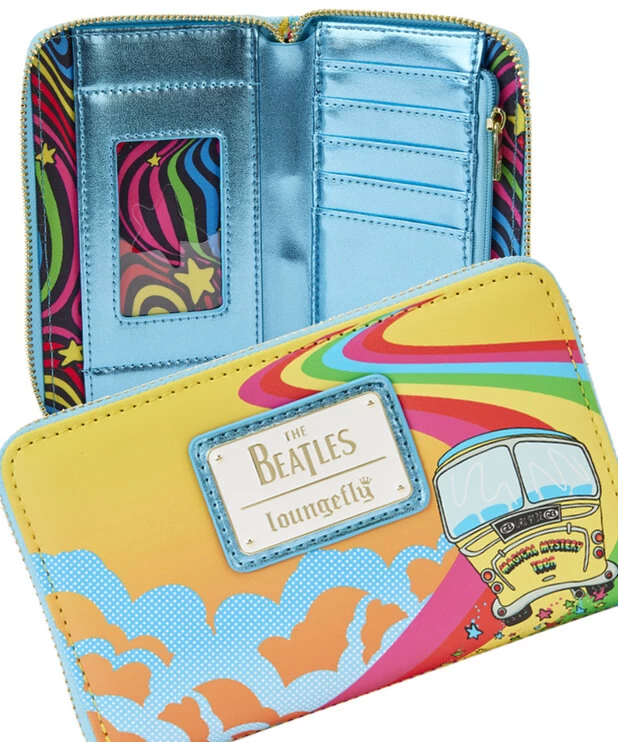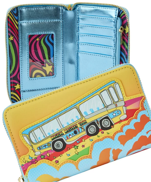 - Le portefeuille zippé Loungefly The Beatles Magical Mystery Tour Bus est fabriqué en cuir végétalien (polyuréthane).